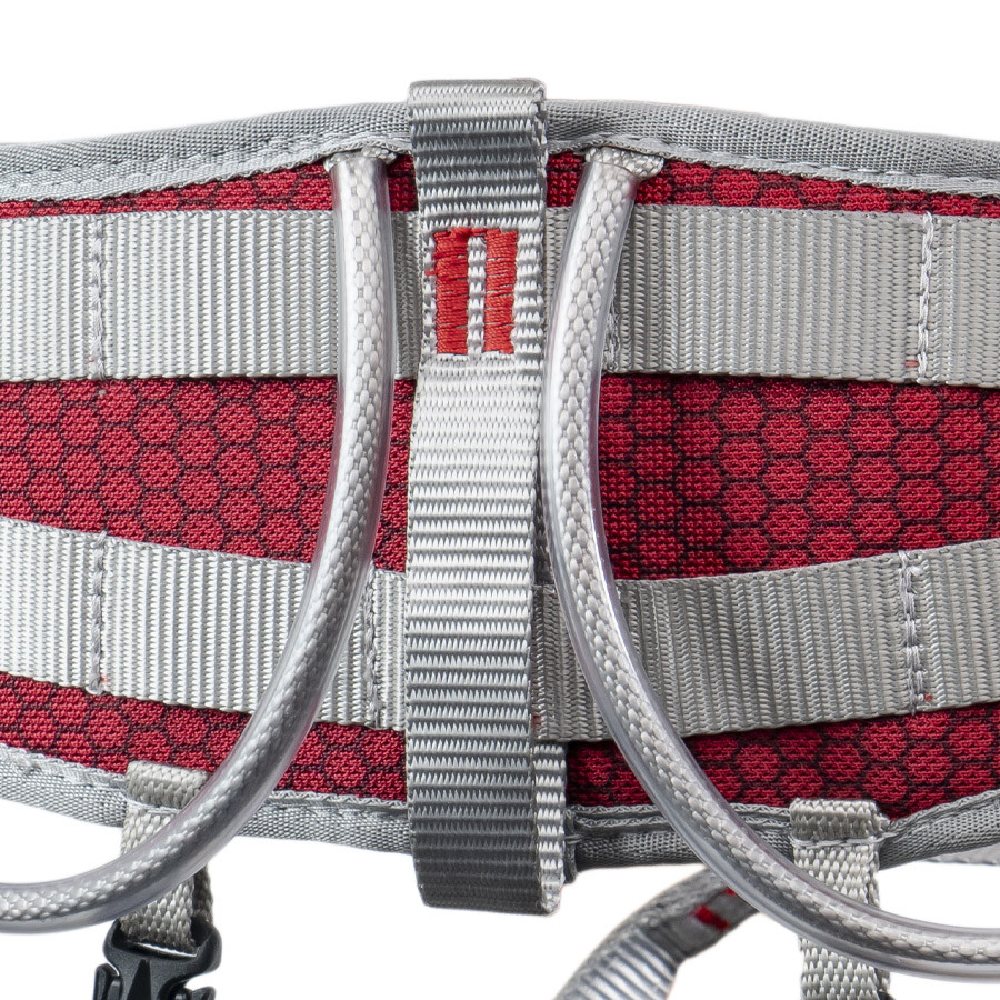• Две страховочные петли из Dyneema позволяют одновременно применять большое количество снаряжения (усы, оттяжки, снаряжение для ИТО, страховочную веревку и пр.) Кольца складываются одно в другое.